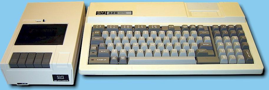 SV-328 (USA 1983)The Spectravideo had a Z80 CPU running at 3.6 MHz, 32 K RAM and 48 K Microsoft Extended BASIC ROM. This computer uses a external PAL-RF converter to be able to use a color television for displaying 40 x 25 characters in 16 colors. A real nice qwerty-keyboard with "real" keys and a cartridge slot on top. She Swedish version had a special cartridge for the national Swedish characters. A cassette deck is used for storage like most home computers at this time. There was later an expansion box with hard drive and two 5¼" floppy disks available.